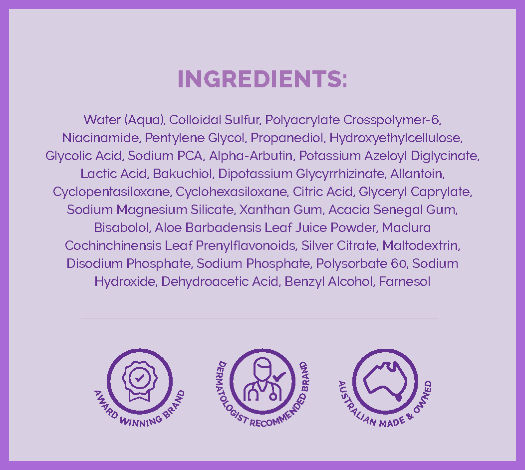 Water (Aqua), Colloidal Sulfur, Polyacrylate Crosspolymer-6, Niacinamide, Pentylene Glycol, Propanediol, Hydroxyethylcellulose, Glycolic Acid, Sodium PCA, Alpha-Arbutin, Potassium Azeloyl Diglycinate, Lactic Acid, Bakuchiol, Dipotassium Glycyrrhizinate, Allantoin, Cyclopentasiloxane, Cyclohexasiloxane, Citric Acid, Glyceryl Caprylate, Sodium Magnesium Silicate, Xanthan Gum, Acacia Senegal Gum, Bisabolol, Aloe Barbadensis Leaf Juice Powder, Maclura Cochinchinensis Leaf Prenylflavonoids, Silver Citrate, Maltodextrin, Disodium Phosphate, Sodium Phosphate, Polysorbate 60, Sodium Hydroxide, Dehydroacetic Acid, Benzyl Alcohol, Farnesol