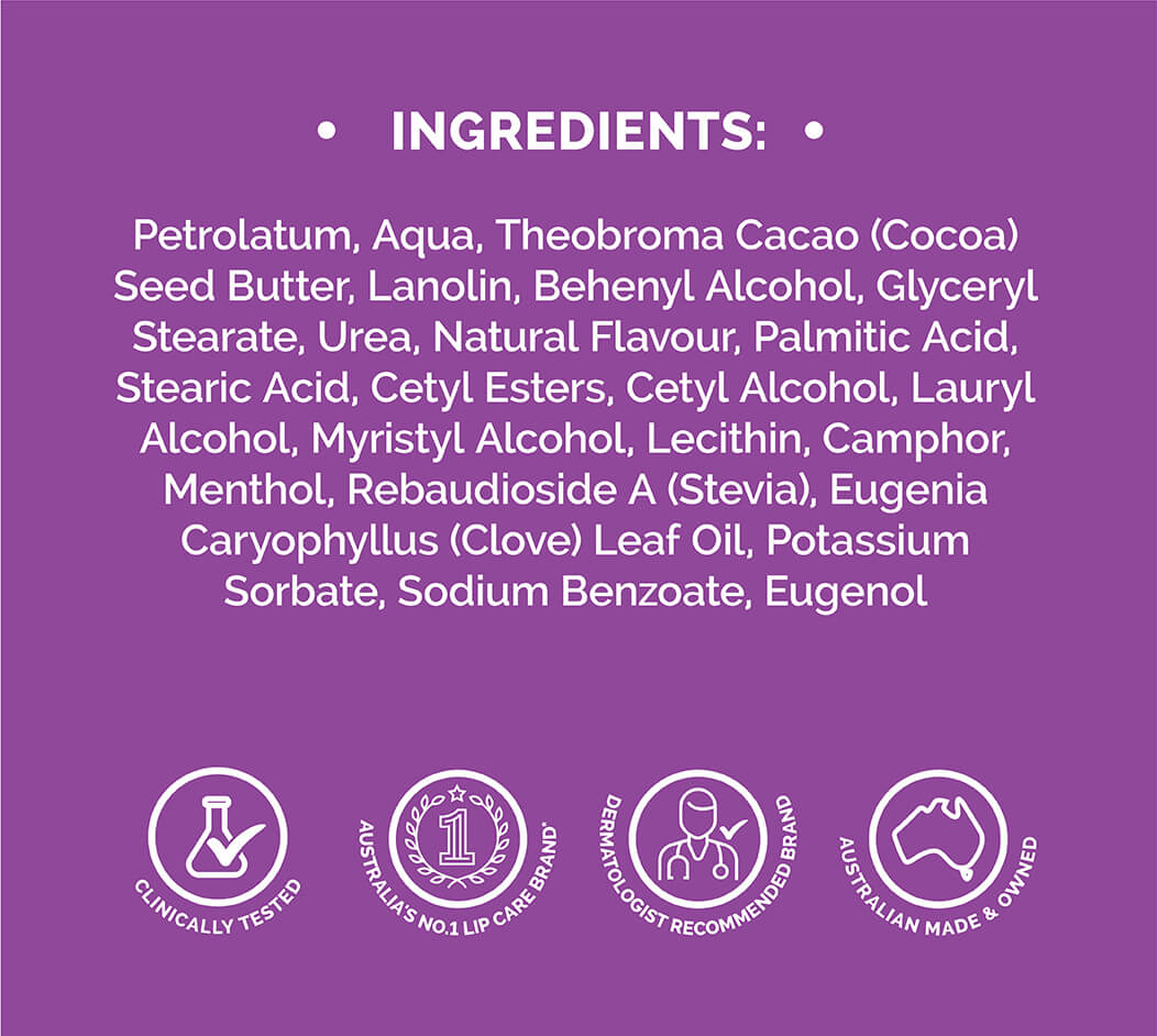 Petrolatum, Aqua, Theobroma Cacao (Cocoa) Seed Butter, Lanolin, Behenyl Alcohol, Glyceryl Stearate, Urea, Natural Flavour, Palmitic Acid, Stearic Acid, Cetyl Esters, Cetyl Alcohol, Lauryl Alcohol, Myristyl Alcohol, Lecithin, Camphor, Menthol, Rebaudioside A (Stevia), Eugenia Caryophyllus (Clove) Leaf Oil, Potassium Sorbate, Sodium Benzoate, Eugenol