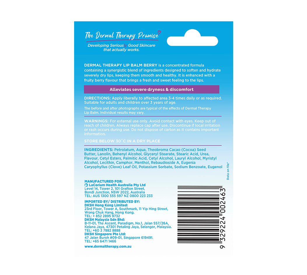 For fresh and smooth feeling lips, try our berry lip balm concentrated formula, paraben free and clinically tested to keep your lips healthy. Dermal Therapy Lip Balm Berry softens and hydrates for the ultimate in lip care.