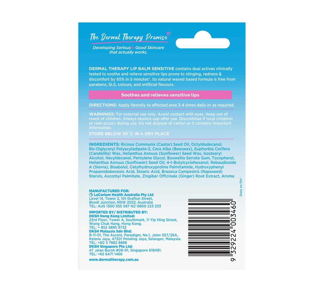 Dermal Therapy Lip Balm Sensitive containing the dual actives, significantly reduces the stinging sensation caused by lactic acid by 64.8 % as compared to the control. Hence, It can be concluded that Dermal Therapy Lip Balm Sensitive effectively soothes and relieves irritated skin.*