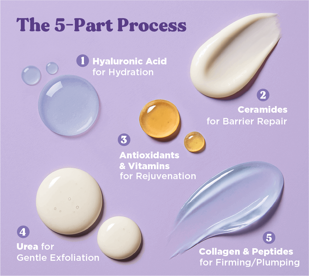 Water, Caprylic/Capric Triglyceride, Glycerin, Cetearyl Alcohol, Urea, Bis-Diglyceryl Polyacyladipate-2, Simmondsia Chinensis (Jojoba) Seed Oil, Dimethicone, Linoleic Acid, Linolenic Acid, Sodium PCA, Panthenol, Hydrolyzed Collagen, Sodium Hyaluronate, Tocopheryl Acetate, Ascorbyl Tetraisopalmitate, Squalane, Ceramide NP, Ceramide AP, Ceramide EOP, Hexapeptide-9, Palmitoyl Tripeptide-5, Phytosphingosine, Ceteareth-20, Sodium Lactate, Carbomer, Ethylhexylglycerin, Parfum, Xanthan Gum, Disodium EDTA, Sodium Lauroyl Lactylate, Cholesterol, Phenoxyethanol, Hydroxyacetophenone, Benzyl Alcohol, Potassium Sorbate, Sodium Benzoate, Benzyl Salicylate, Citronellol, Geraniol, Linalool