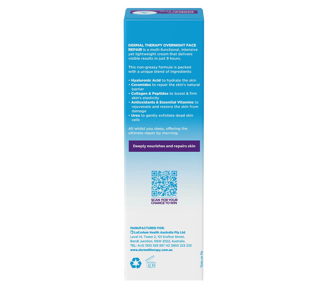 Wake up to visibly smoother, firmer, and deeply hydrated skin with Dermal Therapy Overnight Face Repair Cream. This intensive yet lightweight face cream works while you sleep, delivering clinically tested results in just 8 hours. It hydrates, restores, and rejuvenates for a radiant complexion.