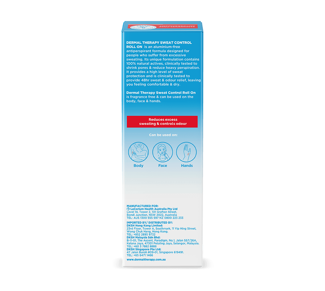 Say goodbye to excessive sweating and hello to Dermal Therapy Sweat Control Roll On — the new generation solution for heavy perspiration. Dermal Therapy’s Sweat Control Roll On is a clinical strength, aluminium-free antiperspirant roll on that helps keep heavy perspiration in check all day long and delivers odour relief for face, hands, and body.