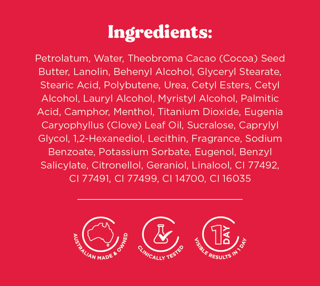 Petrolatum, Water, Theobroma Cacao (Cocoa) Seed Butter, Lanolin, Behenyl Alcohol, Glyceryl Stearate, Stearic Acid, Polybutene, Urea, Cetyl Esters, Cetyl Alcohol, Lauryl Alcohol, Myristyl Alcohol, Palmitic Acid, Camphor, Menthol, Titanium Dioxide, Eugenia Caryophyllus (Clove) Leaf Oil, Sucralose, Caprylyl Glycol, 1,2-Hexanediol, Lecithin, Fragrance, Sodium Benzoate, Potassium Sorbate, Eugenol, Benzyl Salicylate, Citronellol, Geraniol, Linalool, CI 77492, CI 77491, CI 77499, CI 14700, CI 16035